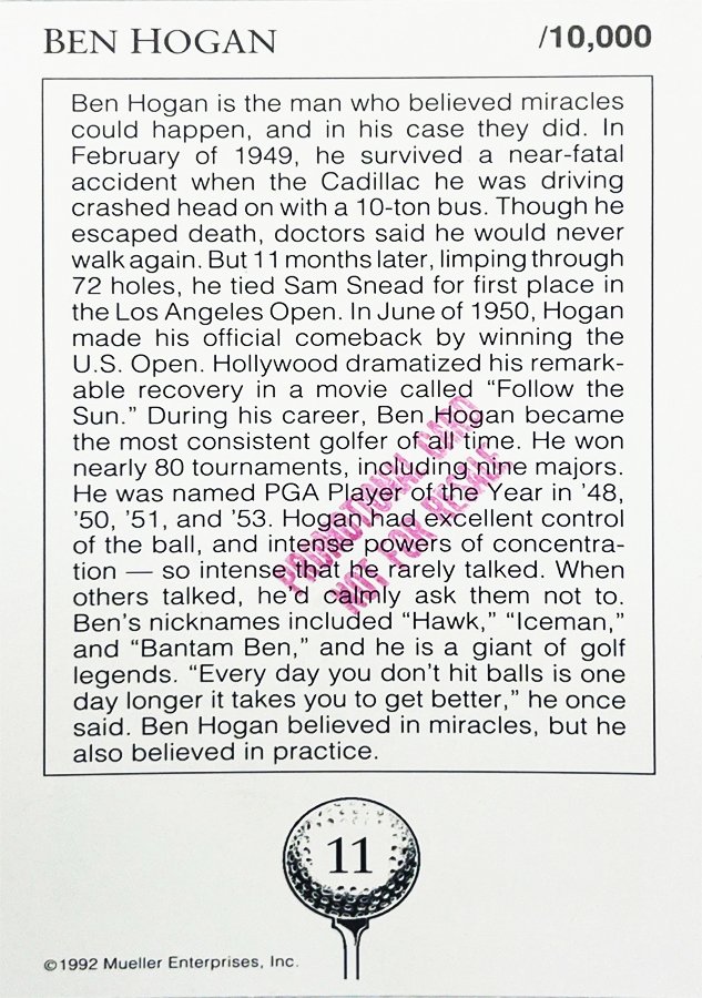 of the card. There were actually two issues of this set. The first was very short lived because two of the cards had to be re-done due to editing of text and final terms were never reached with four other golfers. These six cards from this set are difficult to find. Most of the cards can be found autographed, but watch out for fakes. There were also “promotional” cards distributed to advertise the set and are stamped as such on the back. There were also 100 uncut sheets issued. When you find an autographed copy of this card, Mr. Hogan almost always signed it with either a silver or gold sharpie due to the dark color of his sweater. |