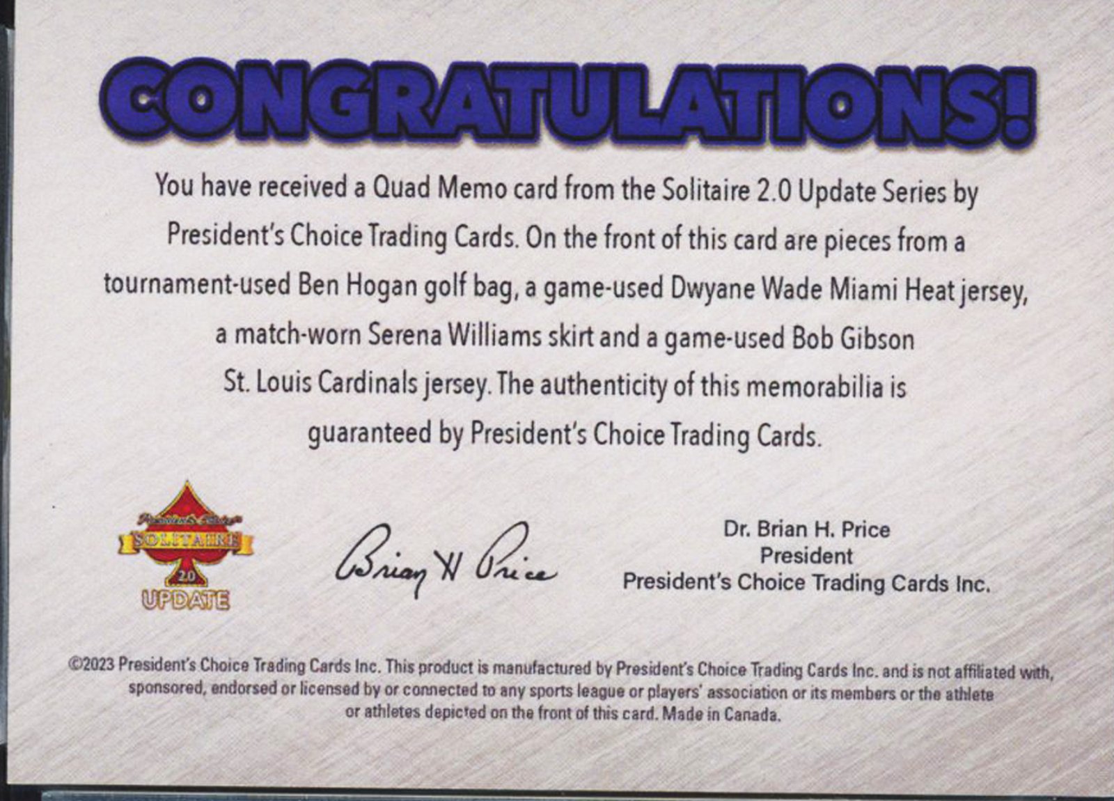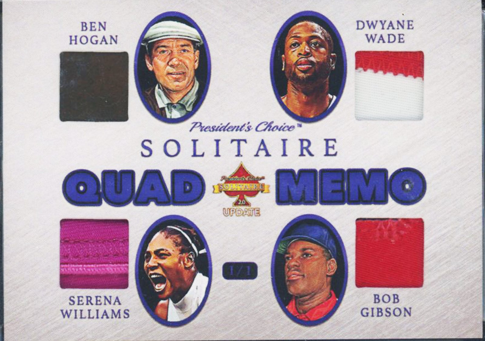 sub-sets which contain golf cards. There are nine Hogan cards in this relaease in the following subsets: (3) "Game Used Memorabilia": Gold - Red - Blue (4) "Quad GOAT": Johnson/Marino/Banks/Hogan Hogan/H. Hogan/Pele/Koufax Ali/Hogan/Abdul-Jabbar/Howe MYINPRSRetirement.org Bird/Marino/Pacquiao/Hogan (1) "Quad Memo": Nicklaus/Palmer/Stewart/Hogan (1) "Enshrined Paper Cuts": Ben Hogan |