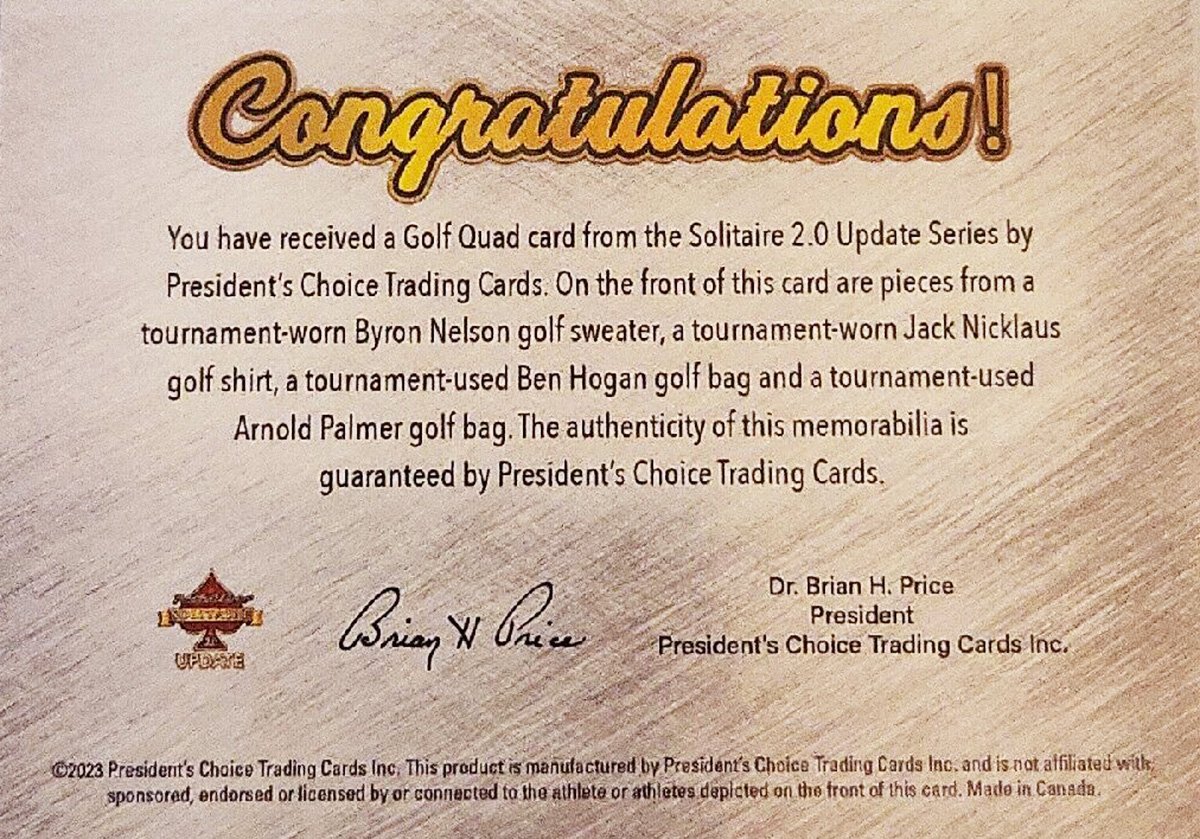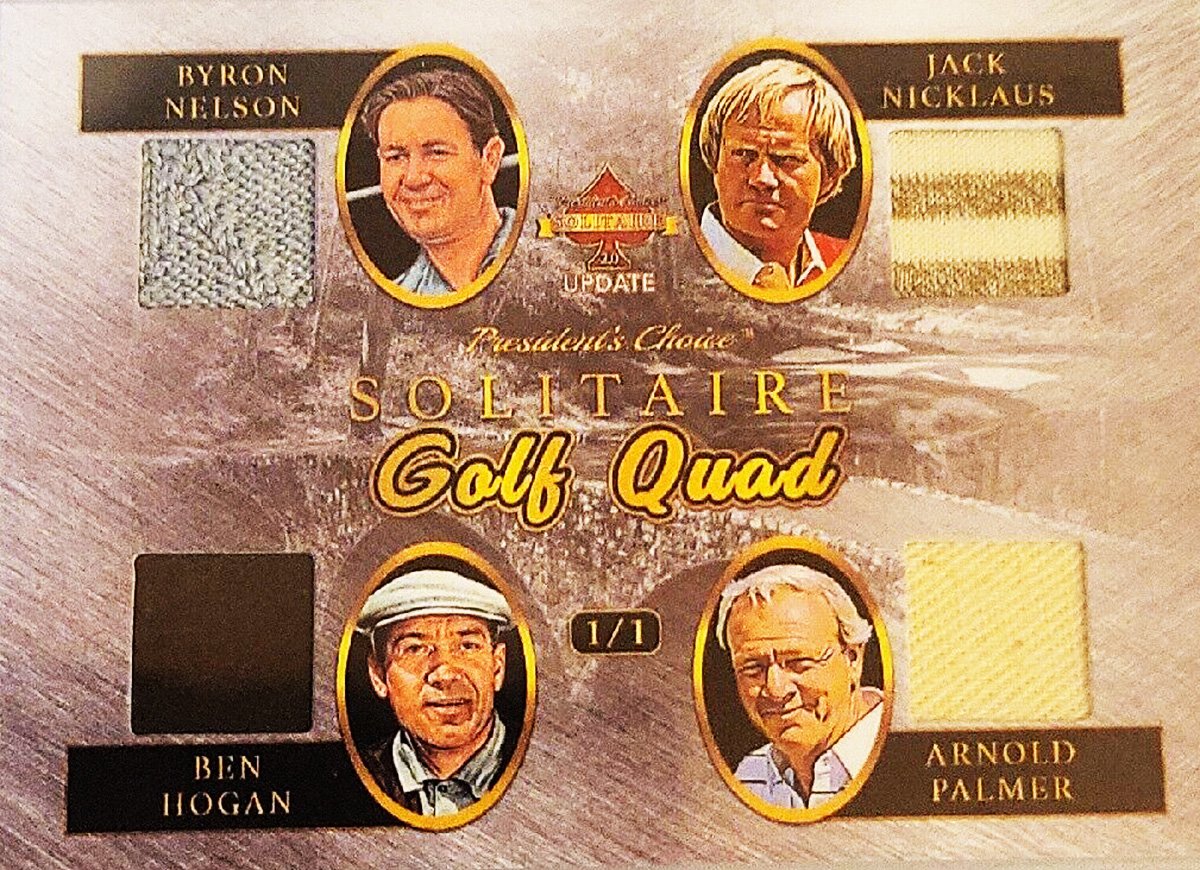 There are five Hogan Cards. (3) "Game Used Memorabilia": Large Red - Large Silver - Large Gold (2) "Quad Memo": Nelson/Palmer/Nicklaus/Hogan Nicklaus/Palmer/Stewart/Hogan |